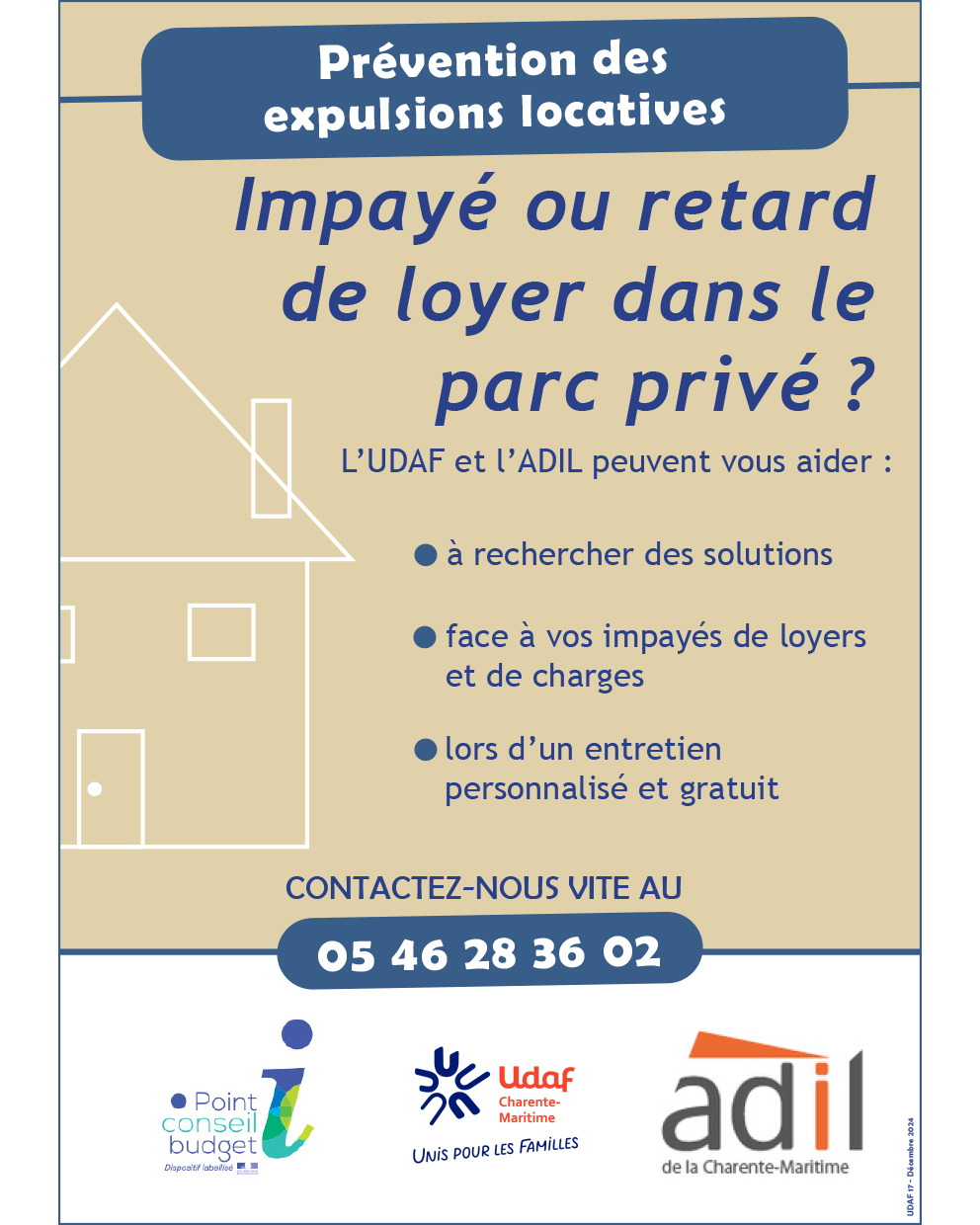 ADIL de la Charente-Maritime 49 Av. Aristide Briand La Rochelle Itinéraire Email Appeler Site web Prévention des expulsions locatives Retard ou impayé de loyer dans le parc privé ? L''ADIL peut vous accompagner : Recherche de solutions adaptées Aide face aux impayés de loyers et charges Entretien personnalisé et gratuit Contactez le 05 46 34 41 36 pour en parler dès maintenant. Parce qu’il existe des solutions, n’attendez pas que la situation s’aggrave. https://www.adil17.org/ Itinéraire Email Appeler Site web